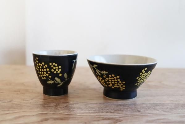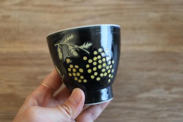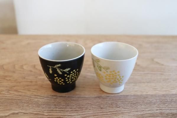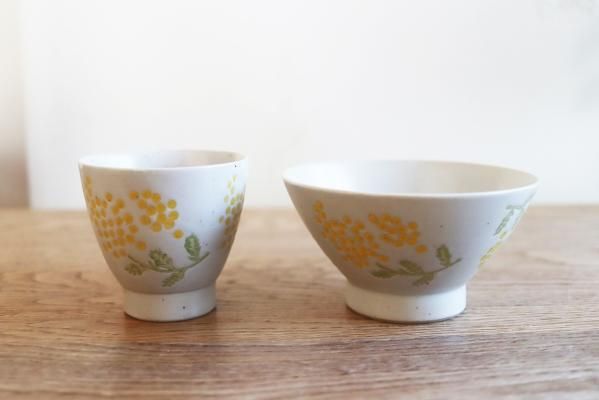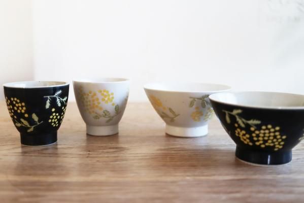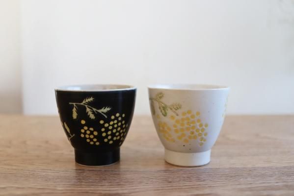 鮮やかなミモザの黄色がひきたつかわいい湯のみです。