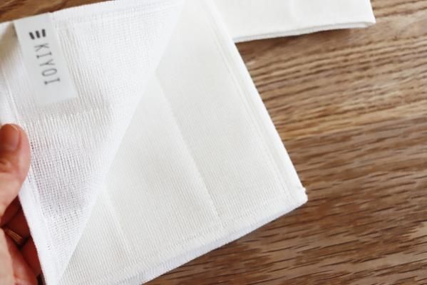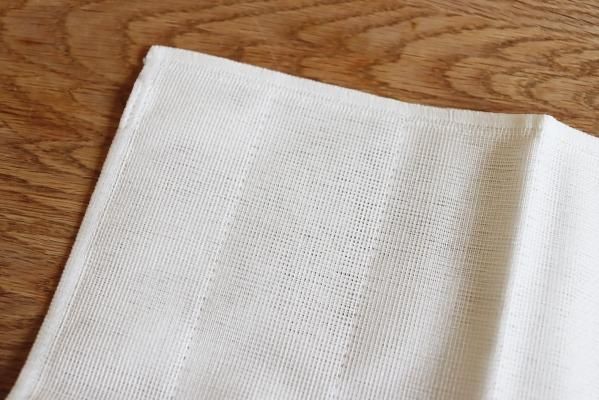 生地の製造過程上で澱粉糊を使用するため、最初はパリッとした見た目ですがぬるま湯で数回濯いでいただきますと糊が取れ、ふんわりとした風合いになります。