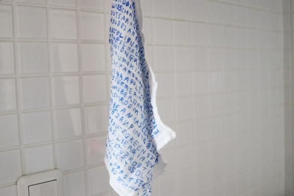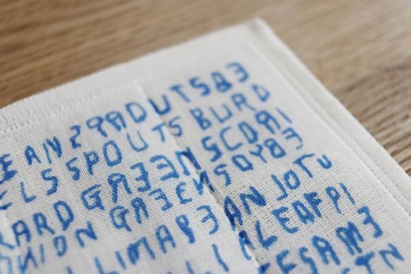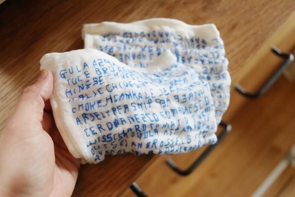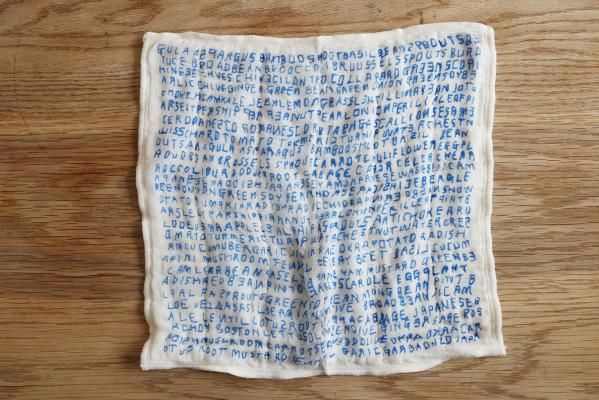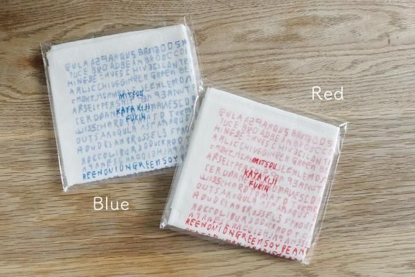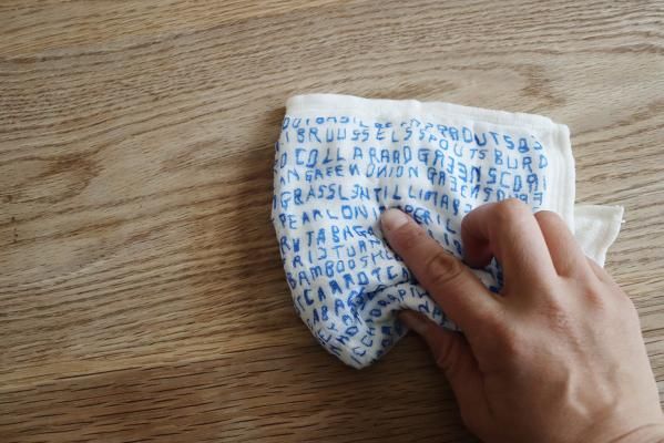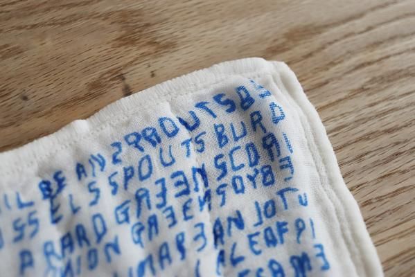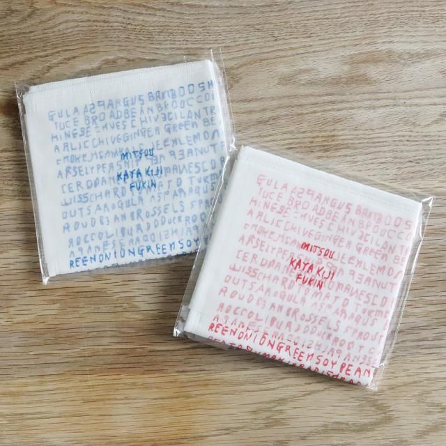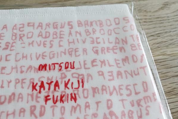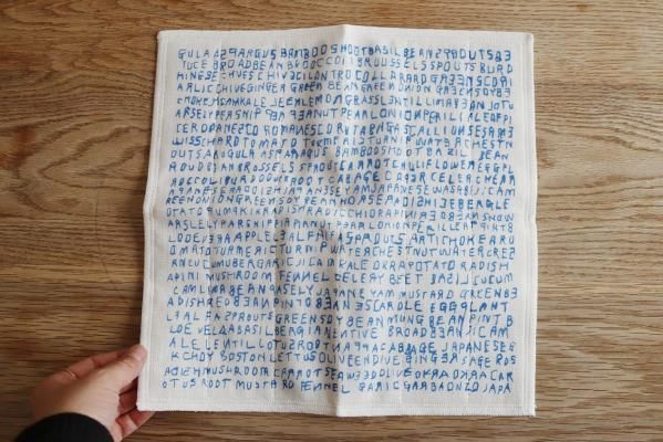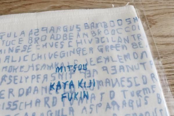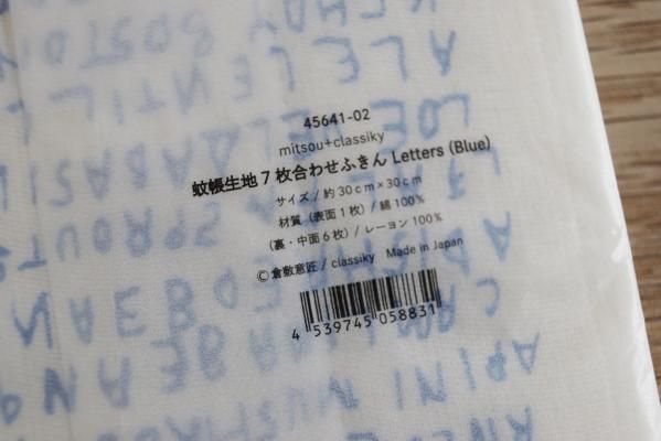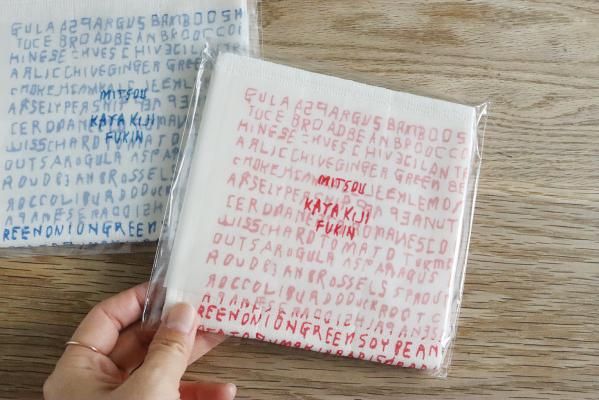 手書きの英字がたくさん並んだ、シンプルながらも目を惹く蚊帳生地7枚合わせふきん。