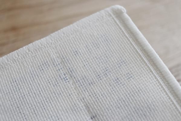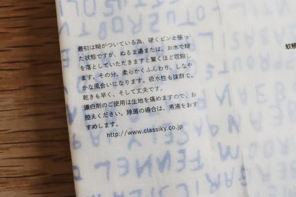 生地の製造過程上で澱粉糊を使用するため、最初はパリッとした見た目ですがぬるま湯で数回濯いでいただきますと糊が取れ、ふんわりとした風合いになります。