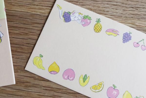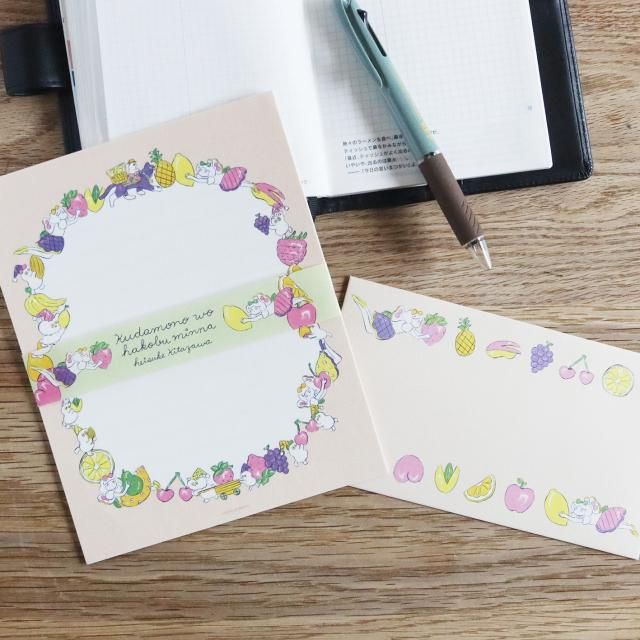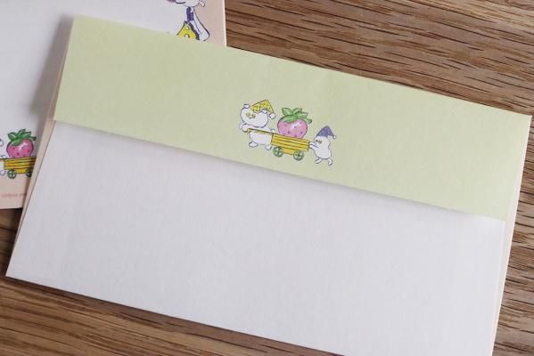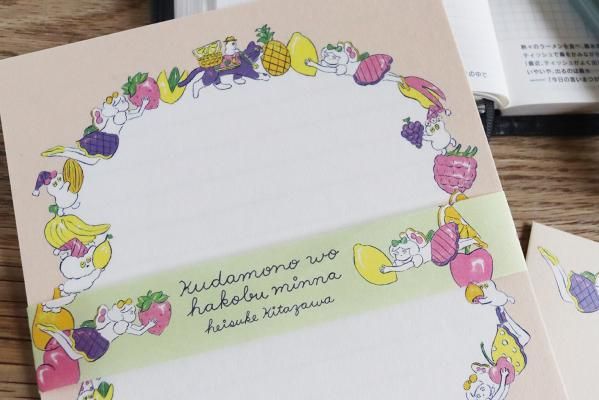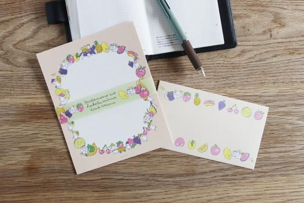 「くだものをはこぶみんな」とタイトルされたこちらのレターセットには、みんなでフルーツを運ぶ様子が可愛らしく描かれています。
