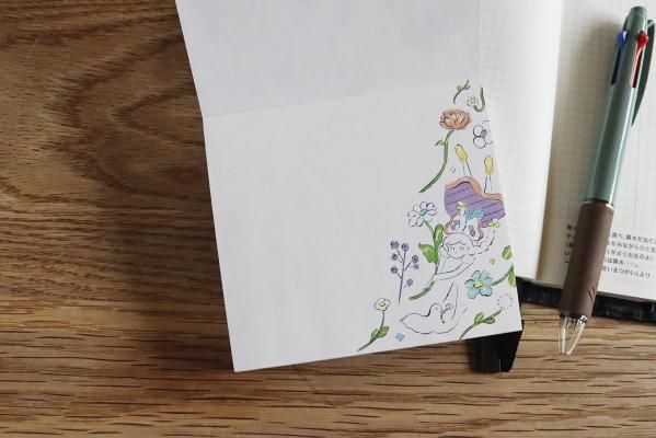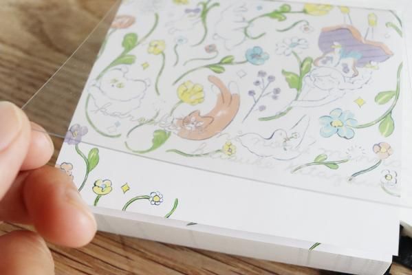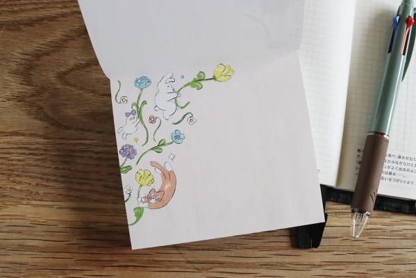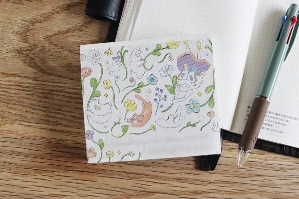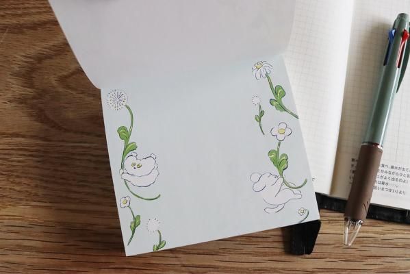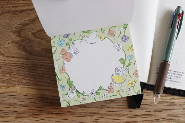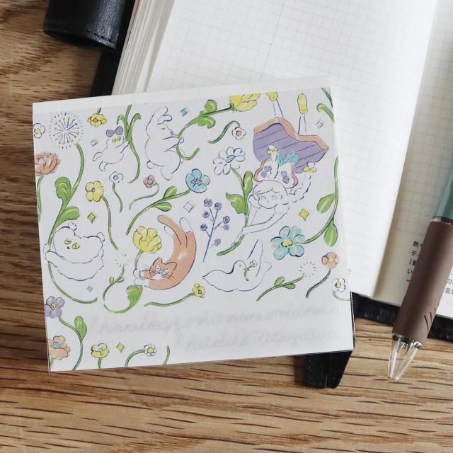 「はるかぜにのるみんな」とタイトルされたこちらのメモ帳には、ふわふわふわりと春風を楽しむ姿が描かれています。