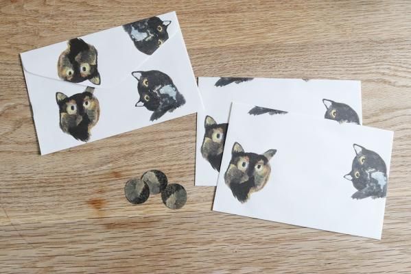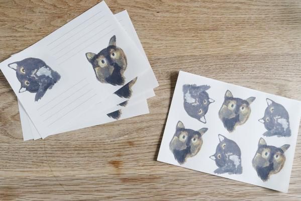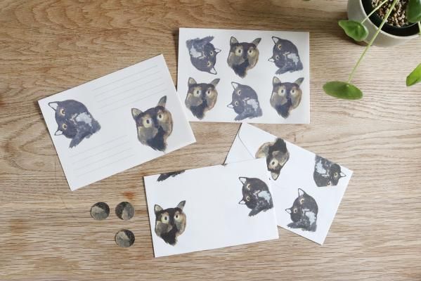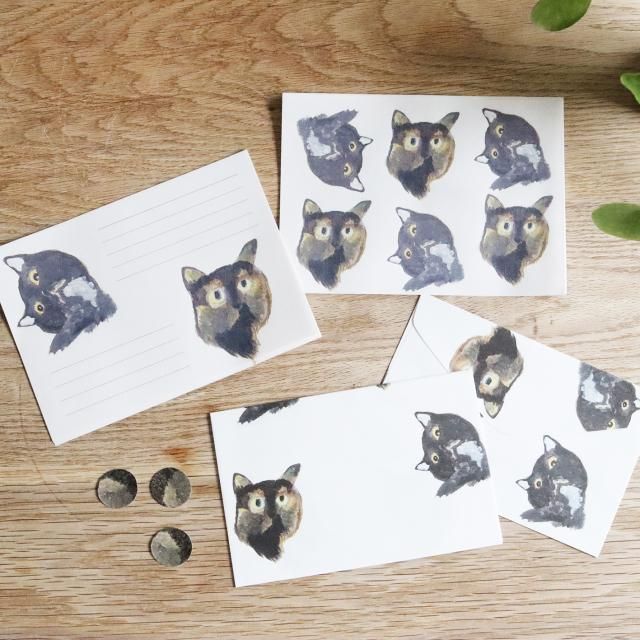 手紙や レターセット さびと黒系ねこちゃんの毛玉シール付き