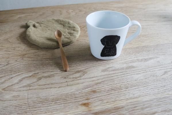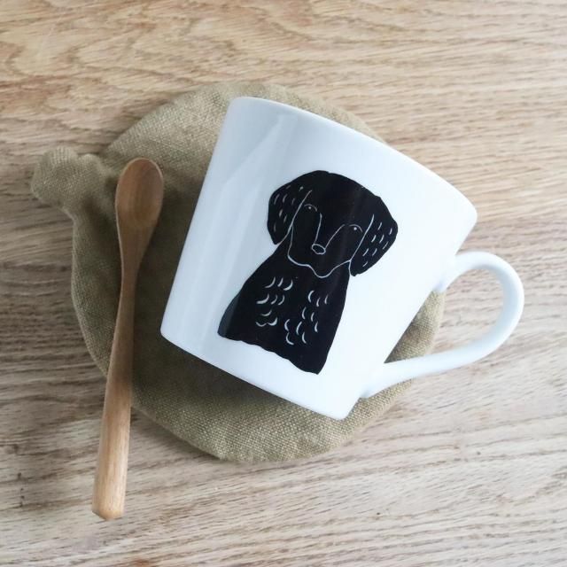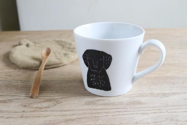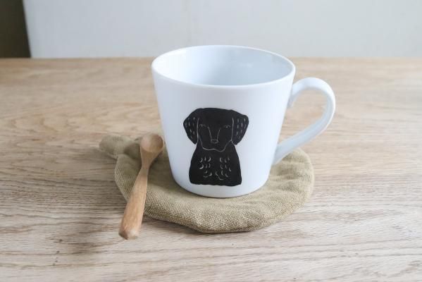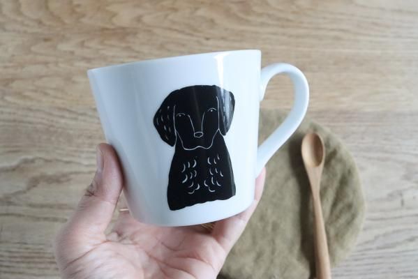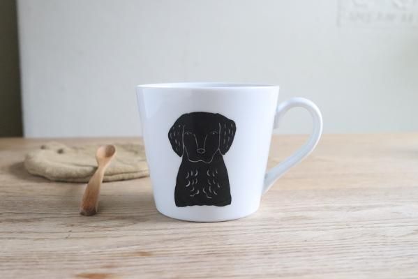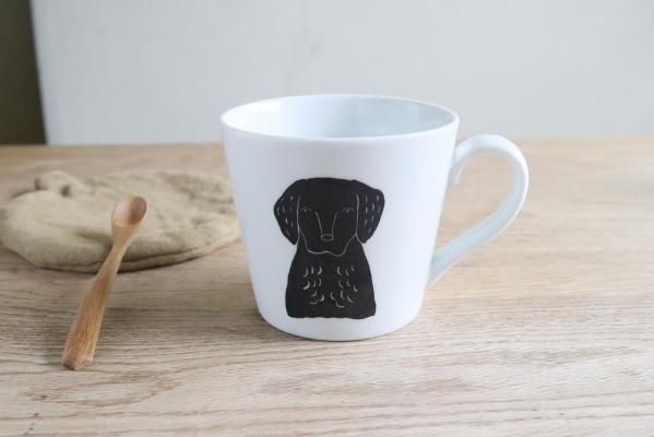 なんとも言えない表情の黒犬がシンプルに描かれたマグカップ。
