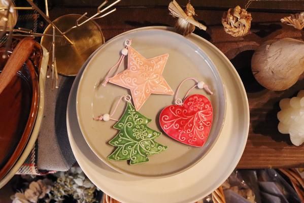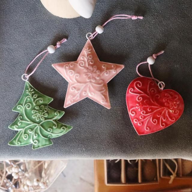 星、ハート、ツリーの3種類がセットになったスチール製のオーナメント。